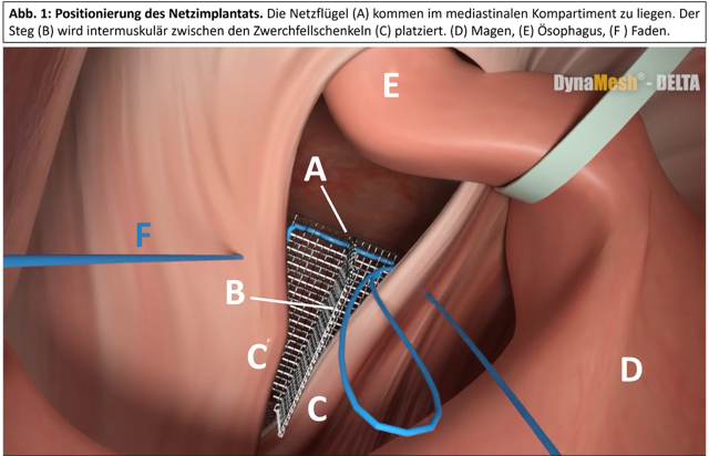 Durch den entscheidenden Zentralsteg wird eine aktive Stoß-auf-Stoß Muskelfusion induziert und sorgt für höchste Stabilität gerade gegenüber den hier vorherrschenden bilateralen und axialen Kraftvektoren. Die durchschneidenden Kräfte von Nähten werden durch schützende hintere Flügel des DeltaMesh flächig abgefangen. Das DeltaMesh ist ausschließlich auf die Fusion des sogenannten „target tissue“, also der kleinen Zwerchfellmuskeln, als Zielgewebe ausgelegt und spart daher andere Gewebestrukturen aus.